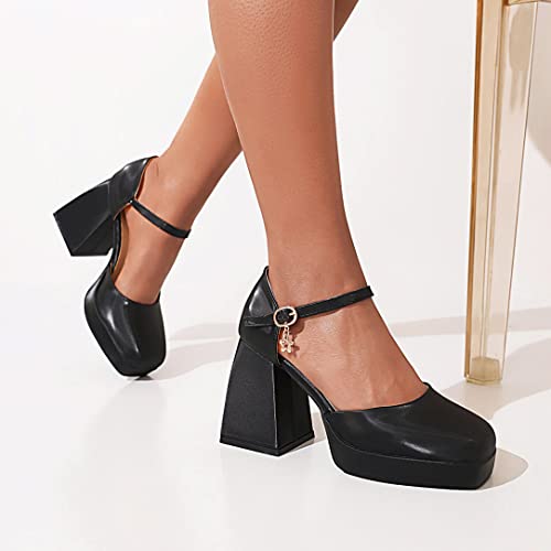 YIYA Women's Chunky Heels Platform Mary Jane Shoes Adjustable Ankle Strap Star Buckle Square Toe Block High Heel Dress Pumps Shoes
