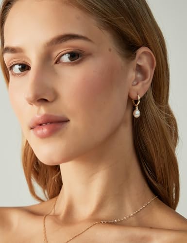 EAMTI Pearl Earrings for Women Trendy 925 Sterling Silver Freshwater Cultured Pearl Huggie Hoop Drop Earrings 14K Gold Plated 5