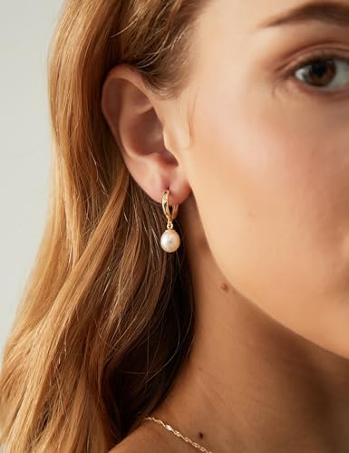 EAMTI Pearl Earrings for Women Trendy 925 Sterling Silver Freshwater Cultured Pearl Huggie Hoop Drop Earrings 14K Gold Plated 4