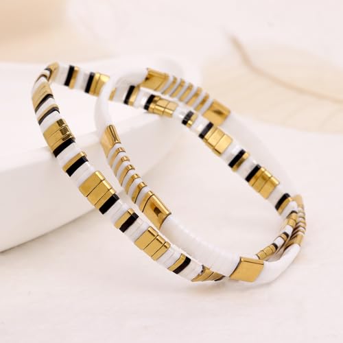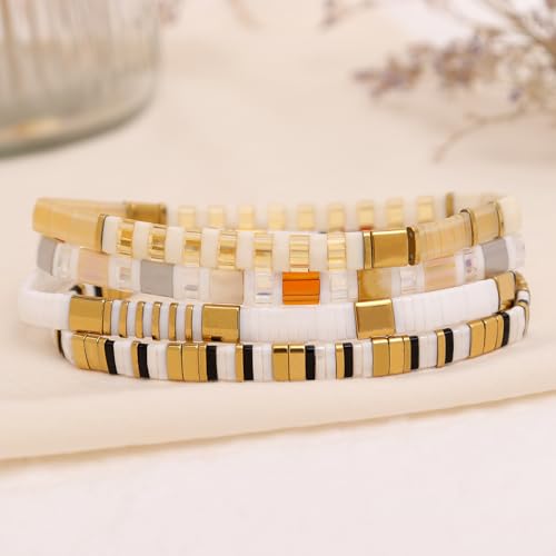 Tila Flat Beaded Bracelets Set for Women, 4Pcs Trendy Handmade Miyuki Glass Gold White Colorful Stack Beads Stretch Bracelet Festive Holiday Accessories Jewelry Gift.