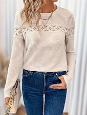 Highlights [Fabric] : Crafted from high-quality polyester with a comfortable micro-elastic feel, this women’s tee presents a sleek waffle-knit texture that’s perfect for transitioning between seasons like spring and fall. [Fit] : The fit is tailored yet relaxed, offering a flattering silhouette suitable for various body shapes. This design ensures a versatile look that can seamlessly be adapted for both casual and dressier settings. [Design Highlights] : Featuring a classic crew neck and elegant lace panel detailing across the chest, this long-sleeve top exudes femininity and sophistication. The patchwork and eyelet details add a one-of-a-kind touch, making it a standout piece in any wardrobe. [Occasions] : Ideal for daily wear, this tee can effortlessly transition from a laid-back day out to a more polished evening look. Pair it with jeans for a casual outing or layer under a blazer for added style on cooler days. [Size Range] : Available in a wide range of sizes from S to 2XL, this tee provides options for a variety of body shapes, ensuring a comfortable and flattering fit.