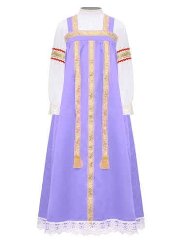 trending ! Child Girls Russian Ethnic Performance Dress Embroidered Blouse with Overalls and Headpiece White&Purple 8 Years