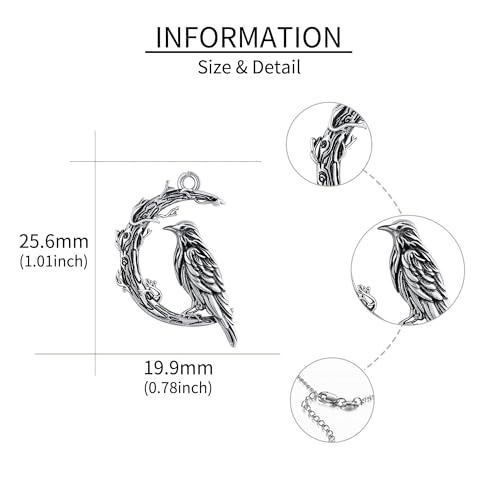 Material: Sterling SilverMetal type: Sterling SilverChain type: BoxGem type: No GemstoneUuique Design: The raven, often seen as a symbol of transformation, intelligence and mystery. The combination of raven, moon and branches evokes a sense of mystery, nature and spiritual connection925 Sterling Silver: Raven necklace for women are top-grade 92.5% silver necklace, hypoallergenicSize: The sterling silver raven pendant necklace size is 0.5 * 0.5 inches with 18+2inch chain. Packaging: 1 x crow pendant necklace for women, 1 x polishing cloth and 1 x exquisite box.Elegance Choice: The raven jewelry for women comes with a stunning box, a wonderful bird jewelry for mothers, wives, friends or yourself, suitable for birthday, congratulations, graduation, Mother's Day, anniversary, Valentine's Day, Thanksgiving, Christmas, etcCare Instructions: This sterling silver crow necklace for women is delicate and should not be exposed to abrasion or chemicals. Please remove before bathing, going to bed or exercising. Perfect for everyday use. High quality materials and excellent craftsmanship ensure long-lasting durability.