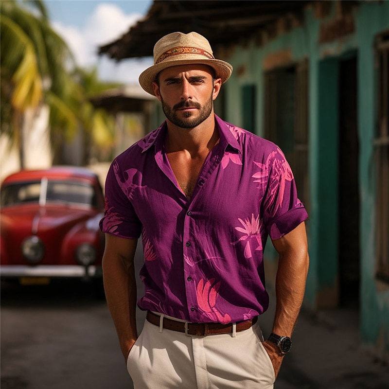 Highlights [Fabric] : Crafted from a 4-way stretch fabric, this men's short-sleeve shirt ensures maximum comfort and breathability, making it an excellent choice for warm weather and tropical vacations. [Fit] : Designed with a regular fit, this shirt provides a relaxed and soft appearance, perfect for both casual and slightly more formal settings. [Design Highlights] : This shirt features a timeless collar and button-up front, accentuated by its vibrant 3D print of palm trees and tropical plants. The rich, earthy brown base color with abstract floral patterns in orange and yellow adds a touch of laid-back elegance. [Occasions] : Ideal for vacations, outdoor activities, beach outings, or any Hawaiian-themed event, this shirt effortlessly blends comfort and style for a variety of settings. [Size Range] : Available in sizes S, M, L, XL, 2XL, and 3XL, ensuring a suitable fit for a wide range of body types.