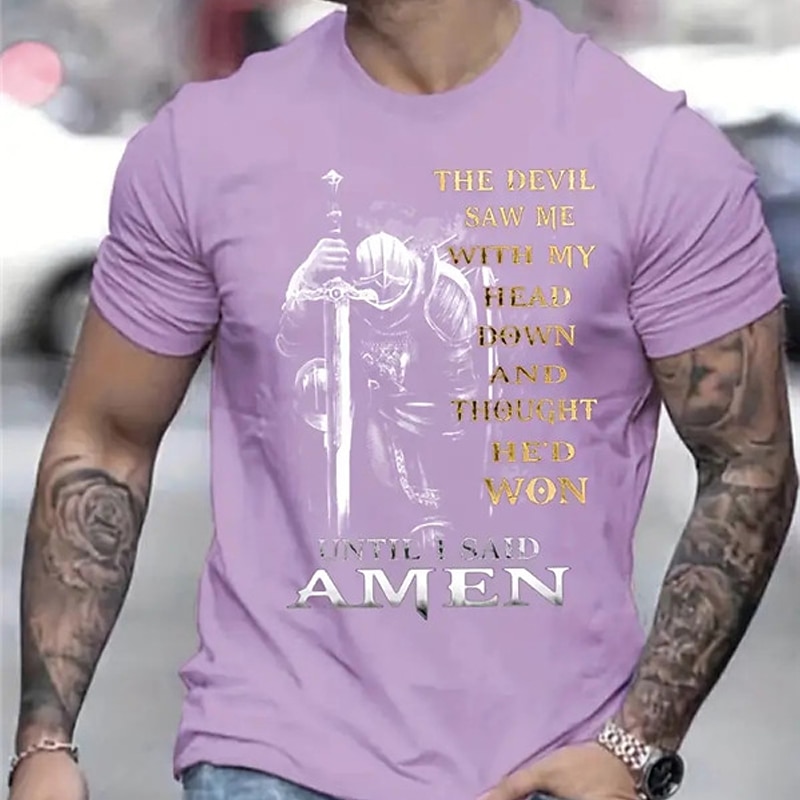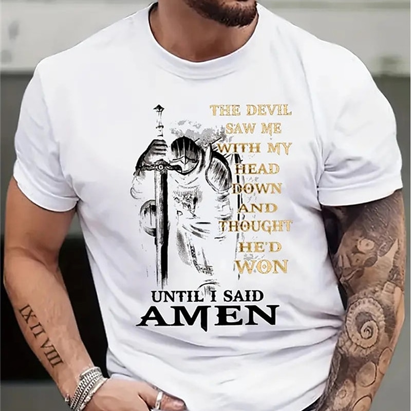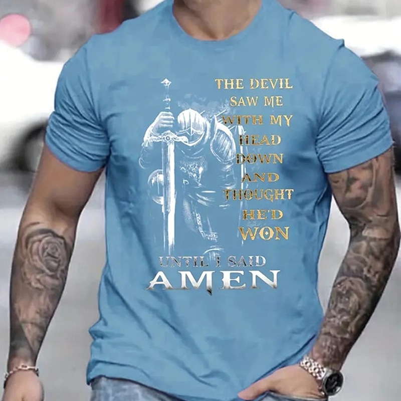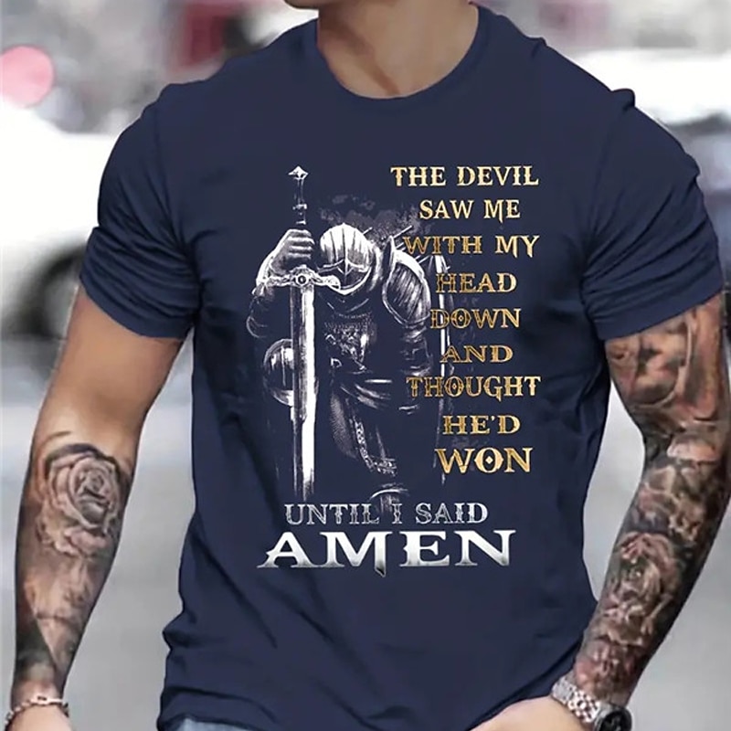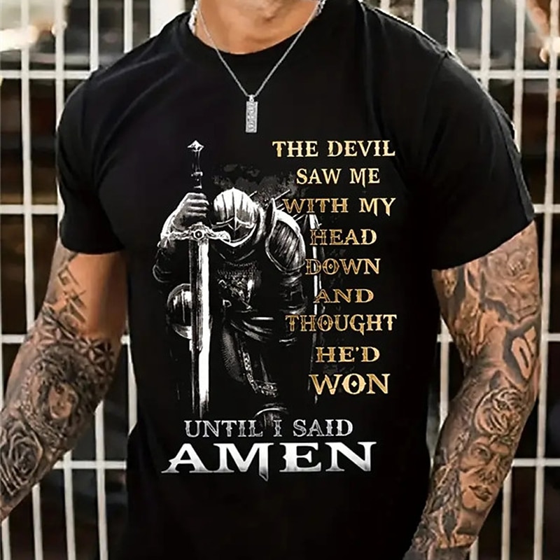 trending ! Men's Inspirational Knight Graphic T-Shirt: 'The Devil Saw Me Until I Said Amen' Faith Design