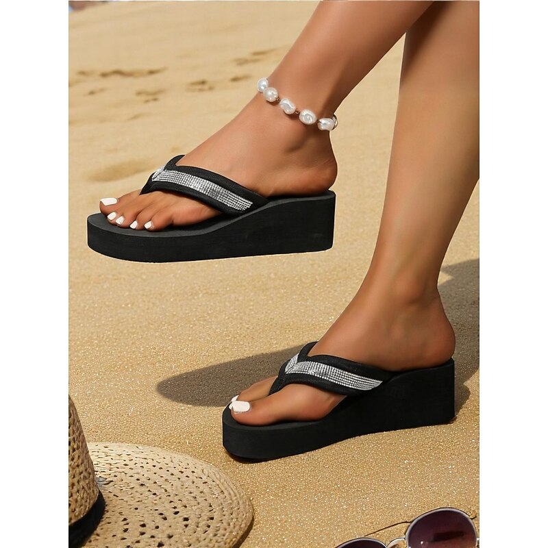 trending ! Women's Platform Flip-Flop Sandals with Rhinestone Straps – Comfy Beach Thong Sandals for Vacation & Summer Wear
