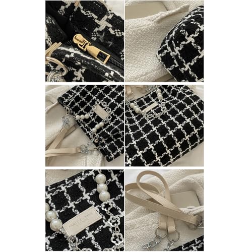 More information about Checkered Crossbody Bag Knitted Plaid Tweed Tote Bag Elegant Checkered Shoulder Purse with Pearl Charm Vintage Woven Handbag