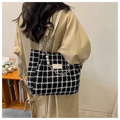 trending ! Checkered Crossbody Bag Knitted Plaid Tweed Tote Bag Elegant Checkered Shoulder Purse with Pearl Charm Vintage Woven Handbag