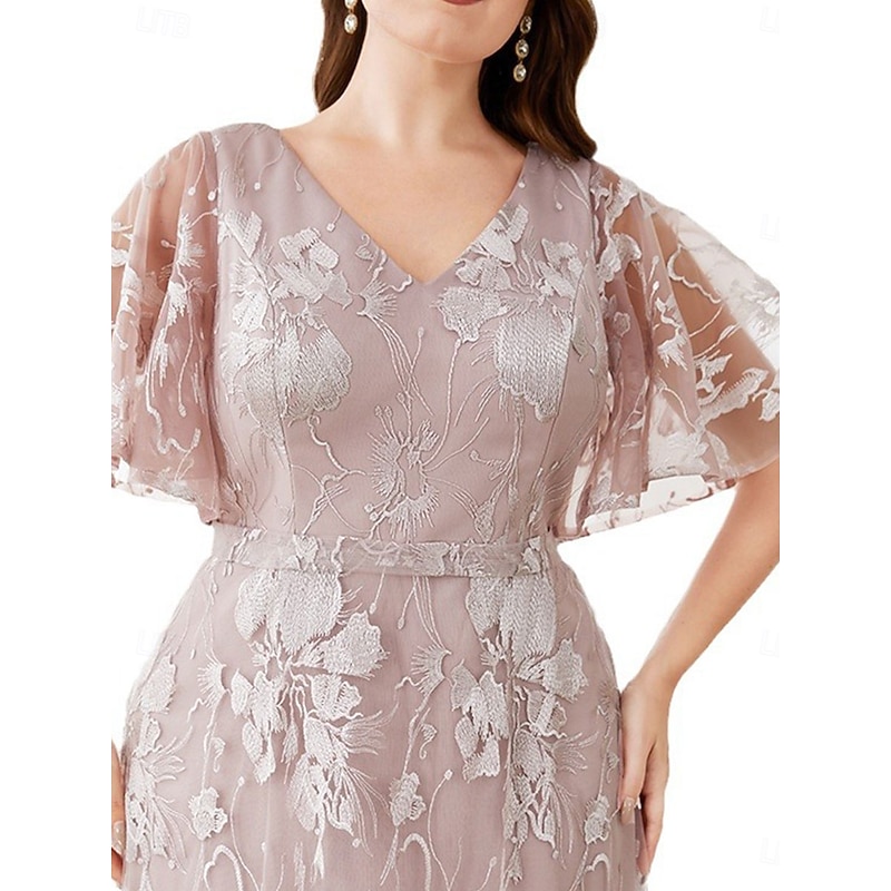 trending ! Plus Size Dress Mother of the Bride Curve Dress Elegant V Neck Floor Length Lace Short Sleeve with Lace