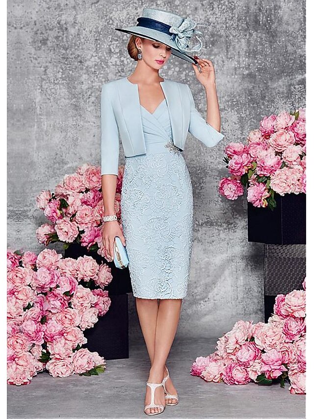 Highlights [Fabric] : Designed with a delicate lace and satin composition, this ensemble offers a refined touch with its intricate lace detailing and luxurious satin finish. The combination provides both elegance and comfort, perfect for making a statement at significant events. [Silhouette] : This two-piece outfit features a sophisticated sheath silhouette, complemented by a knee-length design. The form-fitting style enhances the figure while maintaining a polished look suitable for formal settings. [Design Highlights] : The dress boasts a plunging V-neckline, coupled with a stunning lace split front that exudes elegance. The addition of a crystal brooch at the waist enhances its luxurious appeal, while the included short bolero jacket adds a layer of versatility and sophistication, suitable for various event settings. [Occasions] : Ideal for wedding guests, church ceremonies, and other formal gatherings, this ensemble effortlessly balances timeless charm with contemporary elegance. Perfect for occasions demanding a refined and fashionable appearance. [Size Notice] : Available in a wide range of sizes from US 0 / UK 2 / EU 30 to US 26W / UK 30 / EU 56, ensuring an inclusive fit for various body types. Custom measurements are also available to cater to specific fitting requirements, providing a personalized fit. Perfect for everyday use. top-grade materials and excellent craftsmanship ensure long-lasting durability.
