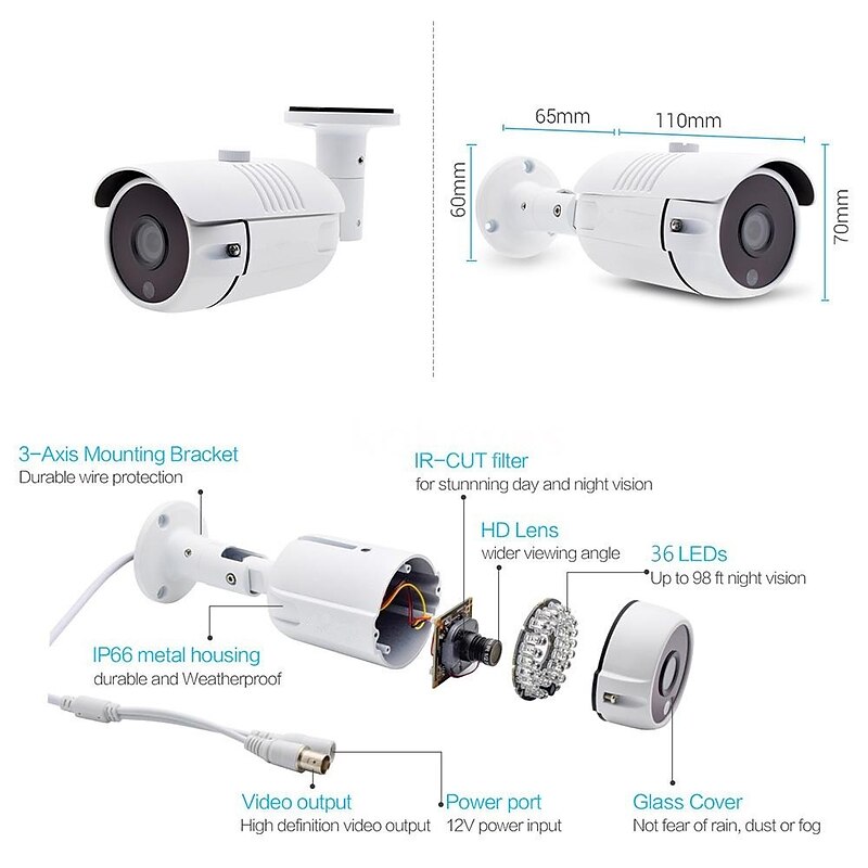 Highlights Product Selling Points: 1. H.265 video compression for efficient storage and high-quality video footage. 2. Available in 2.0/3.0/5.0MP CMOS options for clear and detailed images. 3. Waterproof design makes it suitable for both indoor and outdoor use. 4. Comes with a default lens of 3.6mm for versatile viewing angles. 5. Power supply options include DC 12V or 48V PoE (power adapter not included). 6. Advanced image processing technology for automatic exposure, white balance, and gain control. 7. Supports motion detection, ONVIF, and mobile access for convenient monitoring. 8. Captures super-clear images and offers a wider coverage compared to 1080P IP Cameras. Specification: - Varifocal IP Network CCTV Camera with ONVIF support. - Equipped with a high-performance DSP from Hisilicon. - Available in 2.0M, 5.0M, and 8.0M Pixel CMOS Sensor options. - Output resolutions ranging from 1920x1080 to 3840x2160. - Features auto-switching day/night mode and IR cut action linkage. - Illumination levels of 1.0 Lux (Color) and 0.1 Lux (Black). - H.265/H.264 video compression with dual streaming for efficient storage. - Various video output options for different resolutions. - Frame rates of up to 25 frames per second. - Network interface with RJ45 ethernet and support for various protocols. - Supports standard ONVIF Protocol and third-party access. - Compatible with IE6.0 and above on PC and smartphones (Android, iPhone). - Varifocal lens with a range of 2.8-12mm for adjustable viewing angles. - 30M IR distance with 42pcs IR LEDs for night vision. - Additional features include WEB configuration, OSD, motion detection, and front-end storage. - Compatible with uniform client and platform system applications. - Offers complete SDK for second development. - Power supply options include DC12V or POE. - Operates in temperatures from -10Β°C to +60Β°C, with 10% to 90% relative humidity. ideal for everyday use. top-grade materials and excellent craftsmanship ensure long-lasting durability.