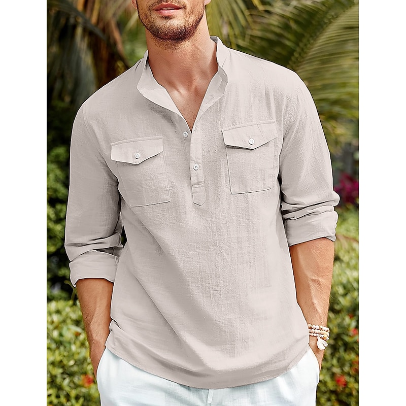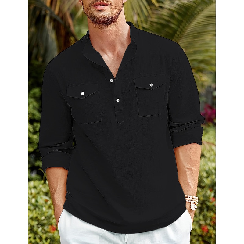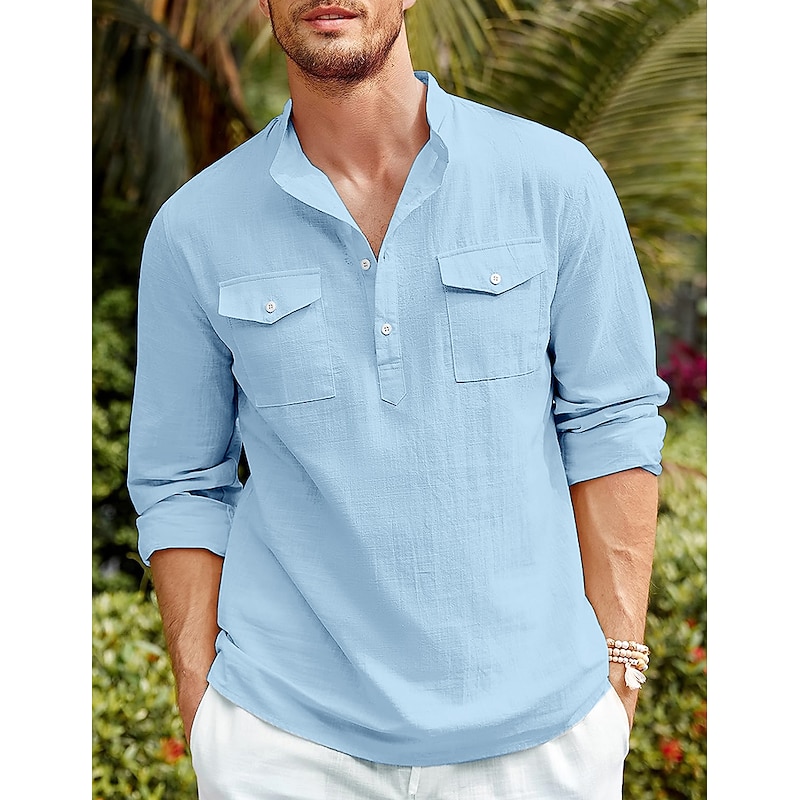 More information about Men's Shirt Linen Shirt Casual Shirt Beach Shirt Black White Blue Long Sleeve Plain Stand Collar Spring & Summer Hawaiian Holiday Clothing Apparel Basic