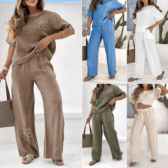 This Women's Active Streetwear Cotton Linen Shirts Blouse Pants Sets Long Sleeve Crew Neck Floral Holiday Going out Weekend White Army Green Blue Summer Regular Fit combines elegant design with practical functionality. Every detail has been carefully considered to ensure you get the best possible experience. The magnificent construction means this product will serve you well for years to come.