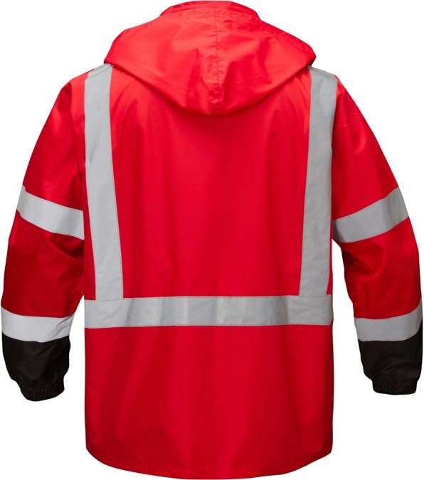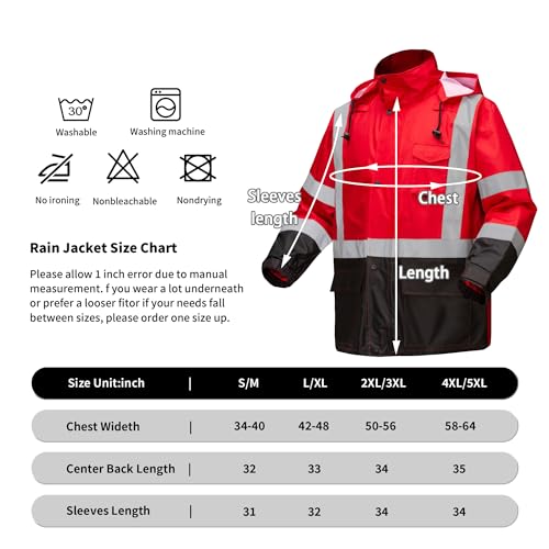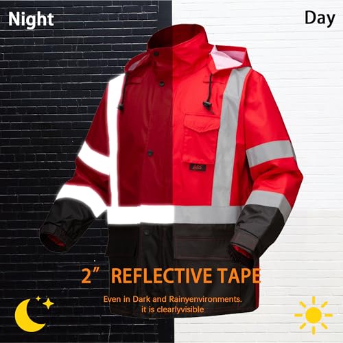 • Hi-Vis Rain Jacket: Jacket made of high visibility material and 2”wide reflective tape,visibility and providing 360°visibility at night or in low light environments with highly visible colors.
