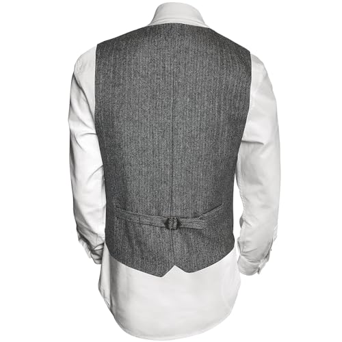 • VINTAGE ELEGANCE: Inspired by the Peaky Blinders era, this grey vest for men showcases a wool herringbone pattern. The full wool back offers warmth, while the adjustable belt ensures a personalized fit. Whether for dress or casual wear, its heritage design and meticulous tailoring make it a standout piece.