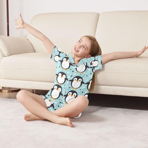 Penguin Holding Hands Satin Summer Pajama Sets Silk Short Sleeve Button Down Sleepwear 4