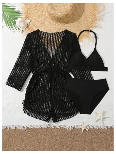 HOT ! OYOANGLE Girl's 3 Piece Swimsuit Triangle Halter Bikini Set with Mesh Romper Cover Ups