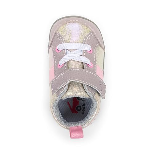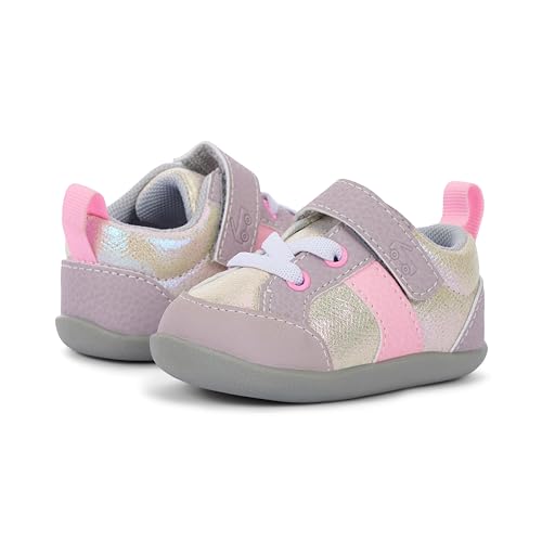 • Adjustable hook-and-loop strap and faux elastic laces allow for a secure fit while generous toe box provides room for healthy foot development