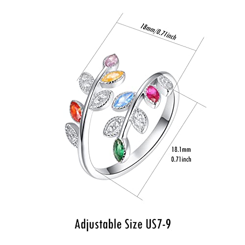 PRAYMOS 925 Sterling Silver Dainty Leaf Rings Rainbow Adjustable Open Ring for Women Cubic Zirconia Tree Jewelry Gifts for Women 7